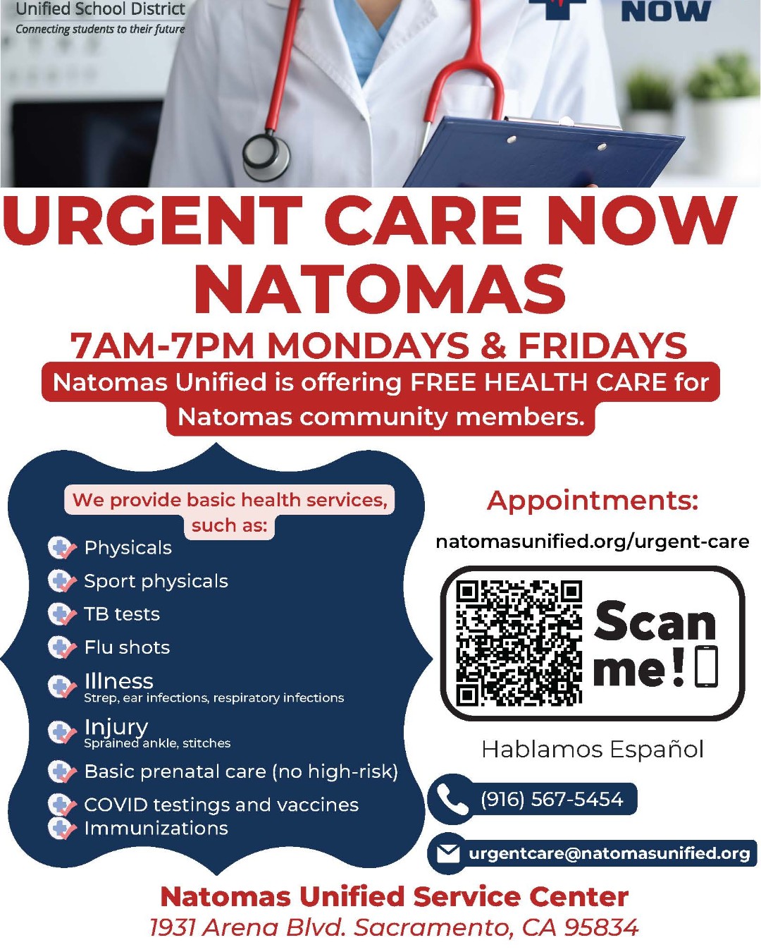 For more information call clinic at 916 947-9110. The Urgent Care Now Natomas clinic will provide basic health care for NUSDs underinsured and uninsured students and immediate family members and staff. You may also walk-in for a COVID-19 test without pre-registering.
